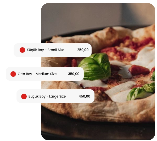 Sunduğunuz ürünler için farklı boy, seçenek ve fiyat alternatifleri oluşturmanızı sağlayan ürün varyasyonları sistemi, müşterilerin doğru ürünü hızlı bir şekilde seçmesine yardımcı olur. QR menünüz üzerinden küçük, orta ve büyük gibi farklı boyutları kolayca listeleyebilir, her bir varyasyona özel fiyatlandırma yapabilirsiniz.
